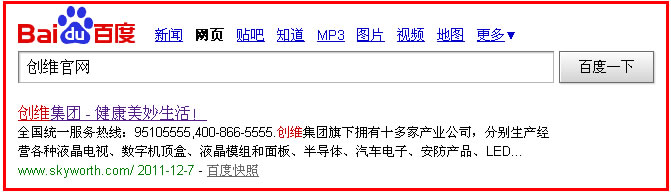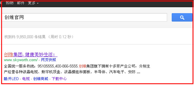 那么这三个名词与搜索引擎优化有什么关系呢?我们尝试在百度或者谷歌输入“创维官网”,然后看结果: