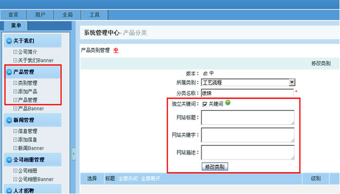 在这里对关键词,网站标题,网站描述进行编排,这里的参数会在整个网站所有的页面中自动调用。当然,如果我们想单独对其他任何一个页面进行单独设置,同样也是可以的,下面我们以产品中心举例。