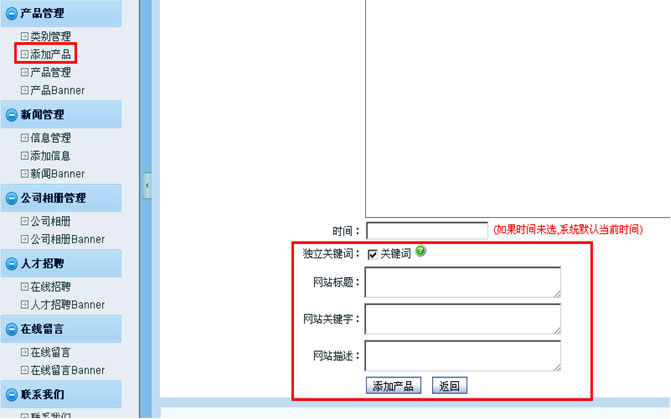 下一步的工作就是针对目标客户可能常用到的关键词,对你网站进行关键词等优化设置,下面我们介绍我们的系统后台如何做搜索引擎优化。